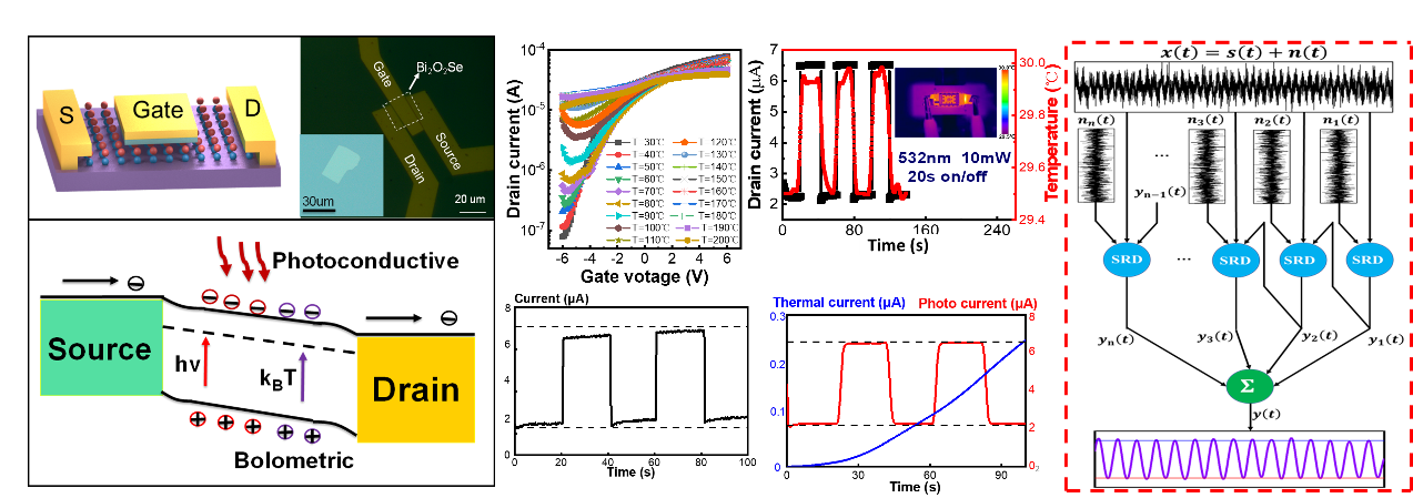 多模态感知是智慧物联网(AIoT)技术的发展趋势,现有方法存在异构界面不稳定、集成密度低、信号冗余串扰等问题,多协同、高精度、低功耗以及CMOS工艺兼容的先进感知技术成为重要研究方向之一。微纳电子学系贺明研究员、黎明研究员、黄如教授团队基于新型铋氧硒半导体薄膜,成功制备了高性能晶体管型单传感层多模态传感器件,实现对温度、光电、辐射热的同步高精度传感,其中温度分辨率达到毫开尔文级,处于国际领先水平。同时提出随机共振去耦合算法,解决了多模态传感信号的精准去耦合难题。