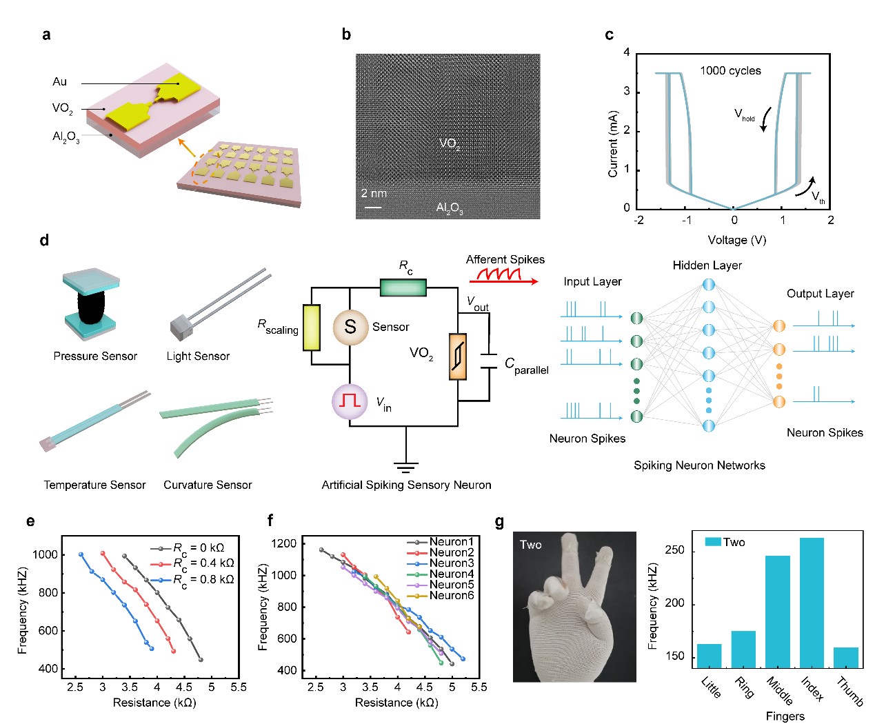 针对这一关键问题,91视频 黄如院士-杨玉超教授课题组首次提出了一种基于外延VO2忆阻器的可校准感知神经元,用于解决人工感知神经元的一致性问题以及神经元与不同传感器阻抗匹配的问题。在材料层面上,外延生长的VO2高质量薄膜显著提高了人工神经元的周期间(cycle-to-cycle)一致性;在电路层面上,通过在神经元电路中引入校准电阻,有效调控了神经元的发放频率曲线,从而进一步提高了不同神经元之间(device-to-device)的一致性。为了解决神经元与不同类型传感器的阻抗匹配问题,进一步引入了缩放电阻用于将不同传感器的工作阻值调节到神经元所适配的阻值范围,从而实现了超高一致性、可校准、多模态的人工感知神经元。
