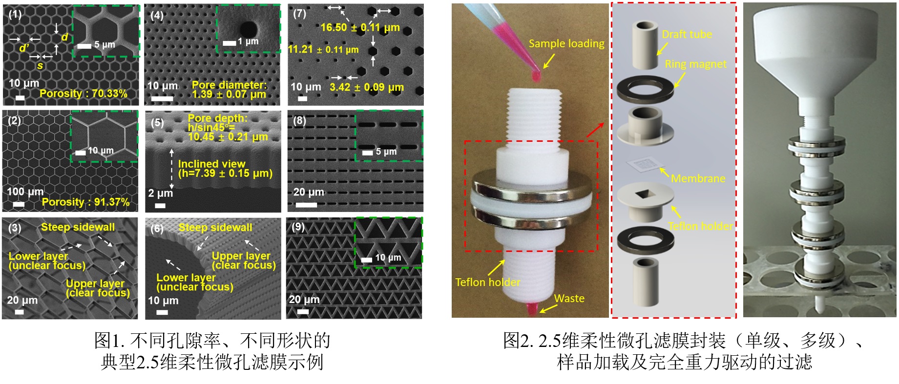 针对上述超大体积通量液态活检方法的关键问题,91视频 微纳电子学系王玮教授课题组基于聚对二甲苯微机电系统(Parylene C MEMS)工艺开发了一种具有高孔隙率(最高可达91.37%)、大面积(大于20 mm×20 mm)的2.5维柔性微孔滤膜。整张滤膜的大面积和小厚度(~10 μm)体现二维特点,而孔−孔间距处的大厚/宽比(10 μm/<4 μm)使局部呈现三维特点;滤膜整体呈现2.5维特点。实验证明,此2.5维柔性微孔滤膜在无需额外压力、完全重力驱动下,实现了超高体积通量:水性样品>117 mL/min,未稀释全血>17 mL/min(文献报道最高记录为2 mL/min)。相关研究于2018年6月以“2.5-Dimensional Parylene C micropore array with a large area and a high porosity for high-throughput particle and cell separation”为题在Nature出版集团期刊 Microsystems & Nanoengineering (2018, 4(1), 13)上发表,期刊编辑在编者按中列为重点介绍,并指出“Experiments proved the new array structure could selectively trap particles ranging from microbeads to cancer cells with throughputs hundreds of times faster than conventional filtering devices”(实验表明该新阵列结构能够以数百倍于传统过滤装置的速度、选择性地俘获微颗粒或肿瘤细胞),文章共同第一作者为微纳电子学系博士后刘姚萍和18级硕士研究生徐涵,通讯作者为微纳电子学系王玮教授和91视频 第一医院李海潮教授(主任医师)。同时,于2018年11月以“Microfabrication of micropore array for cell separation and cell assay”为题在 Micromachines (2018, 9(12), 620) 上发表该柔性微孔滤膜制备工艺文章,收录于特辑“Microfluidics for Cell Assay”。第一作者为微纳电子学系博士后刘姚萍,通讯作者为王玮教授。