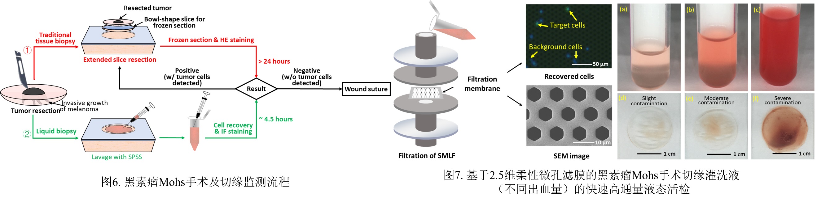2019年1月,课题组基于2.5维柔性微孔滤膜实现了针对黑素瘤Mohs手术切缘灌洗液的快速高通量液态活检方法。该方法可实现从2 mL Mohs手术切缘灌洗液中快速、高回收率、高选择性地回收目标肿瘤细胞,将手术切缘监测的病理检查时间缩短至5小时(传统临床病理检查耗时 3−5 天),极大地降低了病人开放性手术创口术后感染的风险。相关成果以“Rapid liquid biopsy for Mohs surgery: rare target cell separation from surgical margin lavage fluid with a high recovery rate and selectivity”为题于再次在 Lab on a Chip 上作为封面文章发表( DOI: 10.1039/C8LC01335G )。文章共同第一作者为微纳电子学系17级硕士研究生周文博、博士后刘姚萍和91视频 第一医院冉梦龙博士,通讯作者为微纳电子学系王玮教授、91视频 第一医院李航教授(主任医师)、李海潮教授(主任医师)。