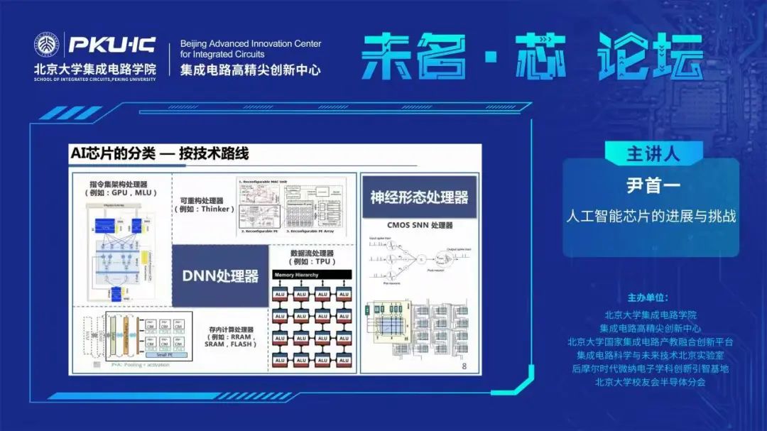 其次从技术路线的角度,尹教授详细分析了深度神经网络(DNN)处理器和神经形态处理器(SNN)两大类AI芯片的具体技术发展。对于DNN处理器,分别介绍了指令集架构处理器,数据流处理器,存内计算处理器,可重构处理器四大类。指令集架构AI处理器具有完整的指令集,其计算过程由指令驱动,可实现神经网络的计算。我国寒武纪、华为、百度等公司都有相关芯片生产研发...