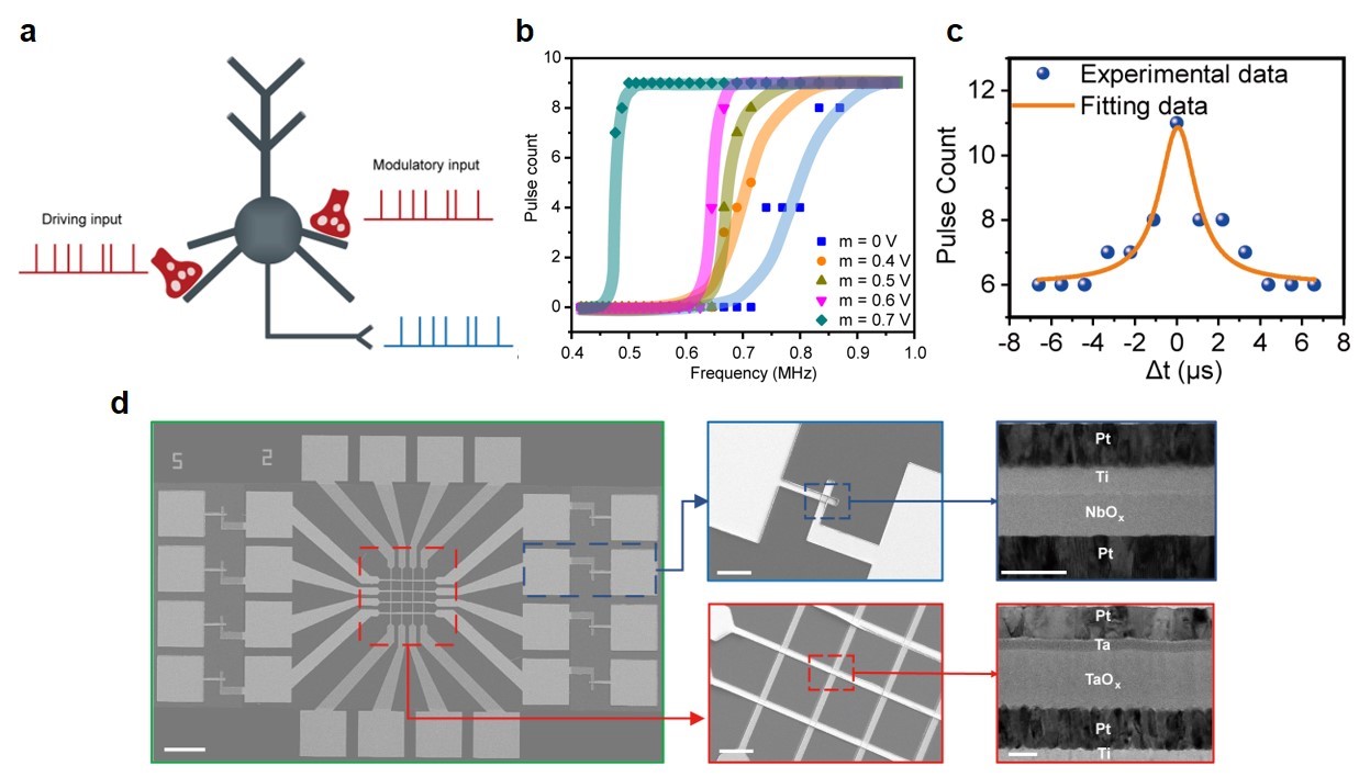 黄如院士-杨玉超研究员课题组提出并研制了一种基于氧化铌忆阻器的新型脉冲神经元,它不仅可以实现传统的全有/全无、阈值驱动发放等神经元特性,而且还可以支持时空复杂性信息整合、在单个脉冲神经元中实现动态逻辑(包括线性不可分的XOR逻辑)以及不同树突输入下的乘...