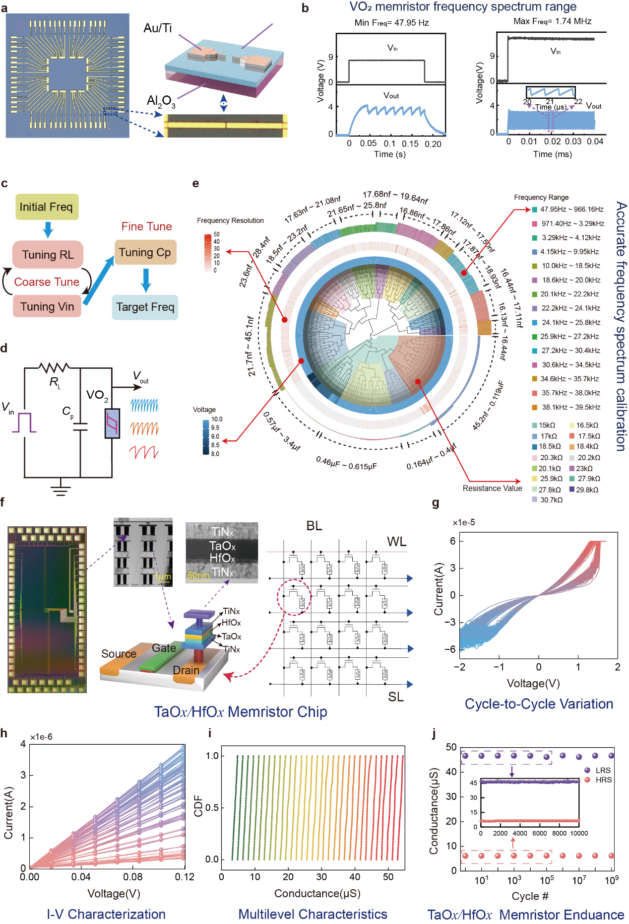 图2:VO₂型忆阻器自振荡可调频率特性与TaOx/HfOx型忆阻器并行存内计算特性异质集成