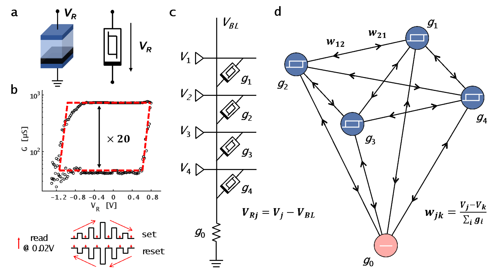 研究团队基于忆阻器自身的阈值、循环、非易失阻变特性,首次证明了由一列双极性忆阻器组成的电路本质上是一个吸引子网络。其中,忆阻器是一种特殊的人工神经元,它的非线性激活函数为双向回滞型,不同于常见的非线性函数,外部施加的电压定义了一个反对称权重矩阵,器件之间的相互作用实现网络的递归。这样的概念还可以扩展到其它器件种类,如单极性或阈值阻变器件,从而用于开发新的吸引子网络模型和硬件解决方案。