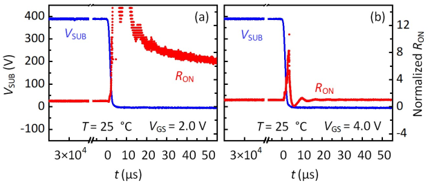 图2. 采用空穴扩展埋层的GaN功率器件计算机仿真结果、体陷阱效应的实验测试结果