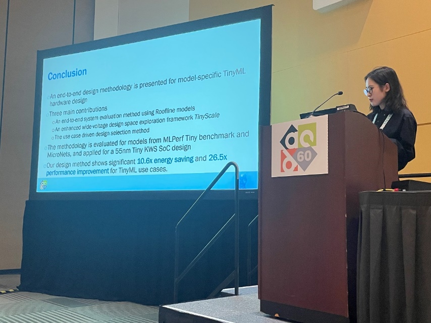 在智能边缘芯片的异构设计复杂度不断提高、算力需求不断上升、硬件资源持续受限等现状下,针对智能边缘芯片面临的来自架构建模、功耗优化、设计方法等多方面的设计挑战和研究需求,叶乐副教授-黄如院士团队提出了一种面向资源受限的TinyML异构硬件的端到端设计方法。该工作主要包括三个贡献。首先,提出了使用Roofline模型的端到端系统评估方法,支持不同算力人工智能加速模块以及通用计算模块的系统性能评估,实现覆盖常见低功耗异构架构的芯片模型选择;其次,在满足边缘应用的实时性要求下,提出在包括近阈值在内的广阔设计空间中探索最优最小能耗点探索方法,通过迭代优化算法评估和优化架构,实现智能边缘芯片的异构架构功耗优化;最后,提出端到端应用驱动的设计空间探索方法,针对特定领域应用模型或者同一类应用模型进行系统性设计,实现特定应用的最优异构架构设计。该设计方法在TSMC 22nm和55nm工艺上进行了评估,与基础架构相比,使用该设计方法在端到端任务中实现了10.6倍的能效和26.5倍的EDP性能提升。此外,该设计方法也应用于实际的关键词识别SoC芯片实现,通过在所有目标用例中探索架构和工作电压条件,该设计可节省13倍的能耗。该工作以《A Model-Specific End-to-End Design Methodology for Resource-Constrained TinyML Hardware》为题发表(博士生董彦池为第一作者,贾天宇研究员和叶乐副教授为通讯作者)。