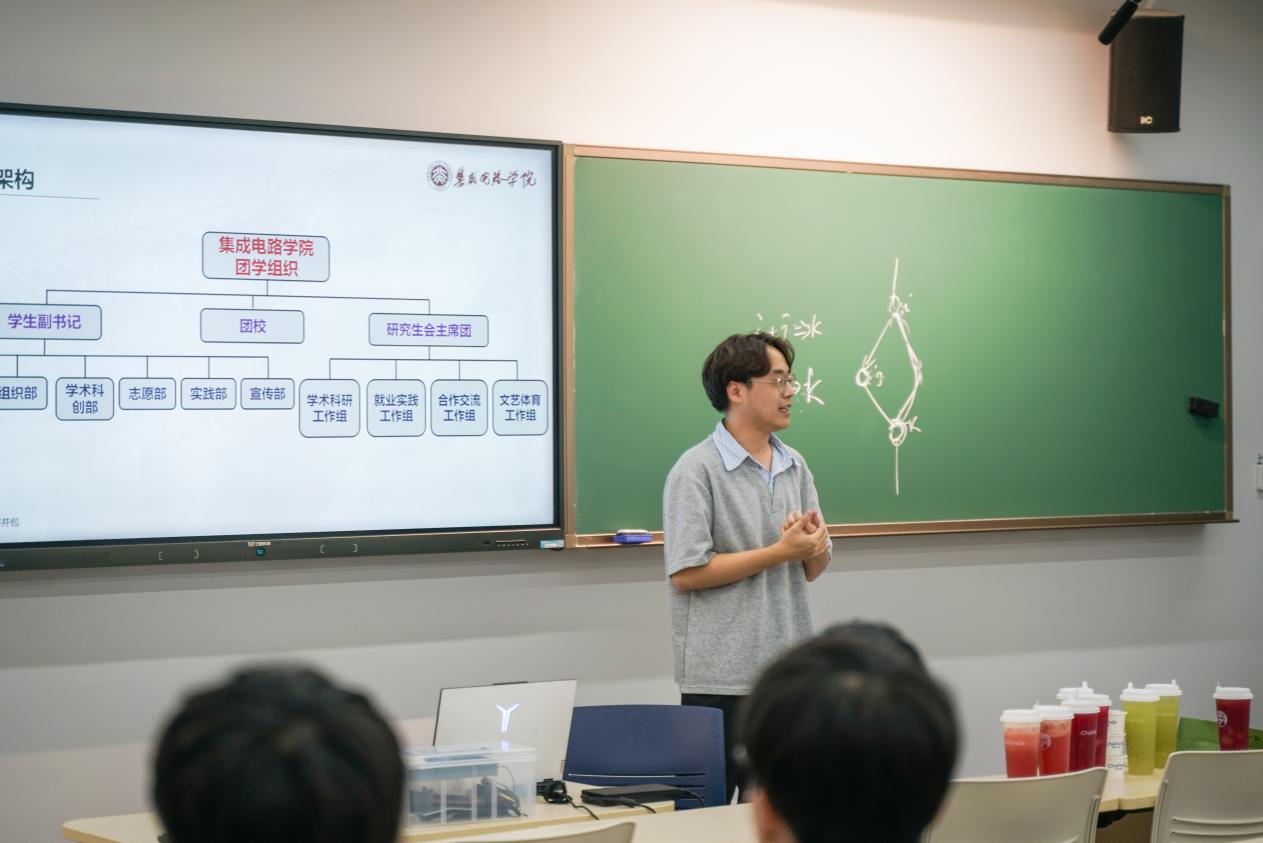 陈傲杰介绍了学术科创部承担的各类学术交流活动的组织与筹备工作,包括全国微电子研究生学术论坛,并与校团委、其他院系交流合作,协助举办和宣传挑战杯、互联网+等学术赛事,以及模拟面试、企业参访等校企合作活动,并表示学术科创部有着众多与优秀老师、学长和学姐交流的机会,欢迎大家通过学生工作实现自我科研素养的提升。