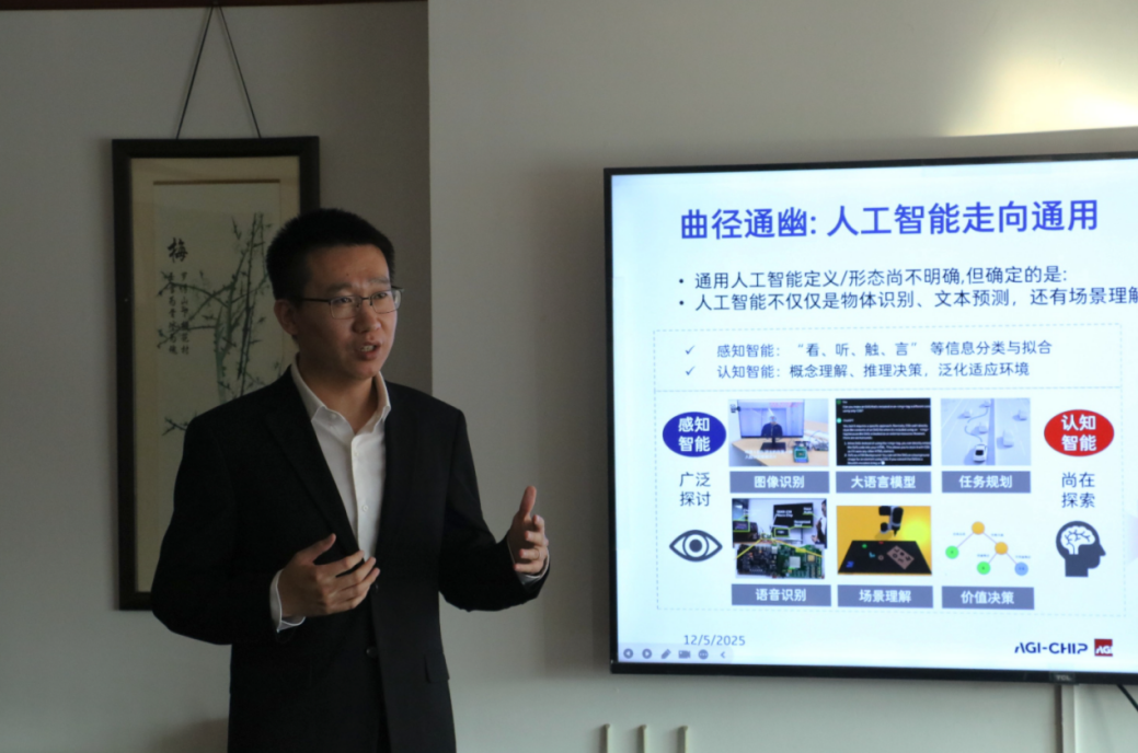 在分享环节中,燕老师以 “面向通用人工智能的算力支撑” 为核心,系统阐述了存算一体技术的发展背景与应用前景。他提到,当前 AI 技术正从图像识别、分类等基础应用,向具备推理、记忆、规划能力的具身智能演进,而算力作为核心支撑,成为突破技术瓶颈的关键。燕老师重点展示了团队近期的多项创新成果:世界首个全柔性存算一体芯片,可实现卷曲状态下的稳定计算与存储,为柔性机器人等终端设备提供了全新技术方案;基于忆阻器和 SRAM 的存算一体芯片及系统集成方案,已在端侧与云侧加速神经网络计算中展现优势;通过单片三维集成技术提升计算与存储密度,为大模型加速提供了高效解决方案。此外,燕老师还介绍了团队在认知架构设计、组合优化加速器、概率计算硬件等领域的探索,强调未来计算机架构将逐步向人类认知架构靠拢,实现 “快思考与慢思考” 的协同。