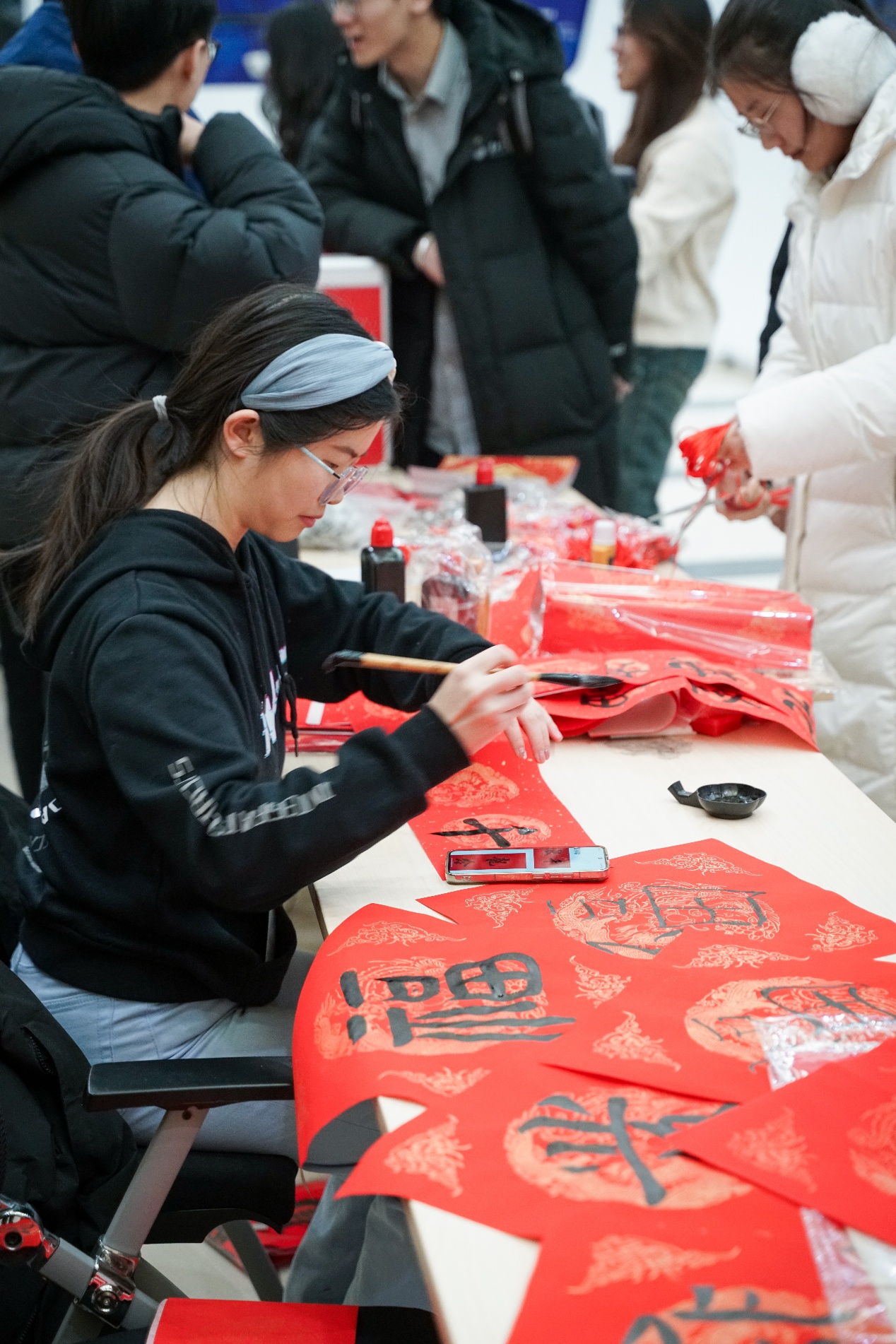 除了精彩的节目表演,活动现场还举办了发福字、书写春联、编织中国结等传统文化体验活动。同学们自由发挥,用一双巧手表达对新一年的美好祈愿。