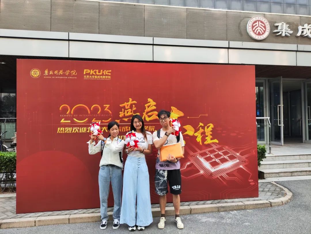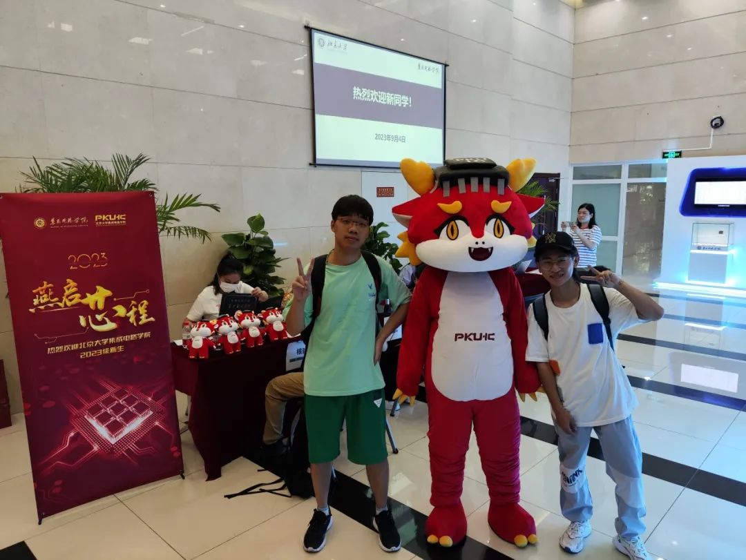 同学们怀着初入燕园的好奇与激动之情,手持学院标志,和吉祥物“莫斯电龙”开心合影,留下了在燕园的记忆。