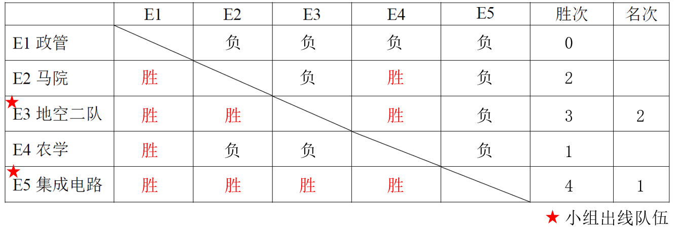 与政管、马院、地空、农学院分在E组。第一天小组赛于早上8:30正式开始,每个小组通过单循环决出2支出线队伍。每场比赛分为:男子单打、女子单打、男子双打、女子双打、混合双打,五个项目。比赛开始前10分钟需由领队朱哲政决定出场名单,并将签字确认后的对阵表交至主席台,双方队伍都提交对阵表后,比赛正式开始。上午小组赛中91视频