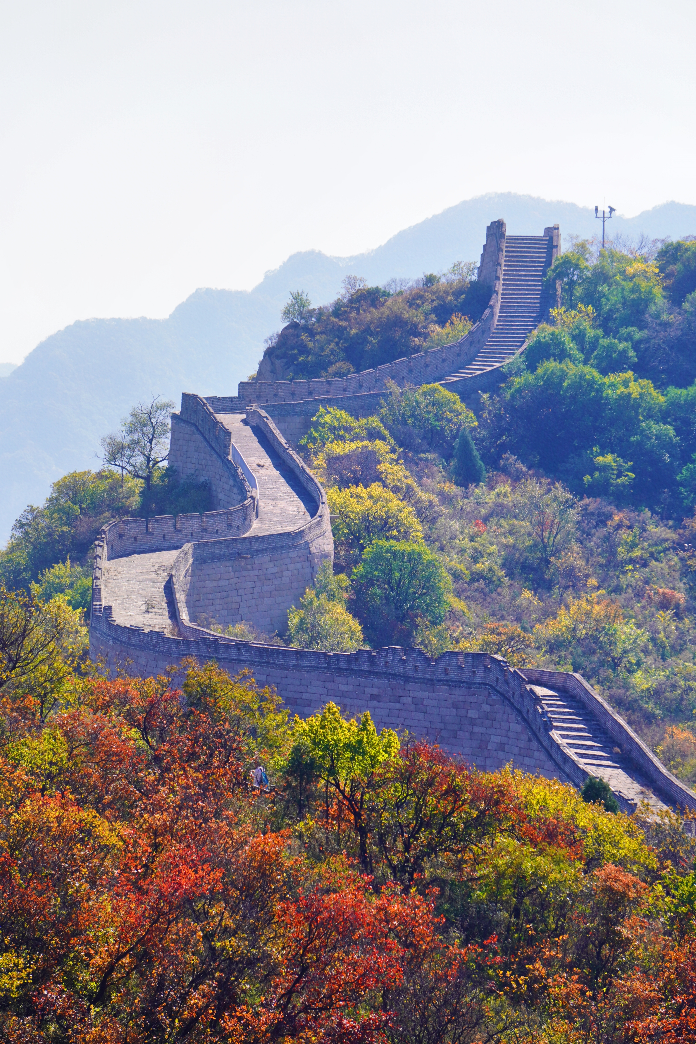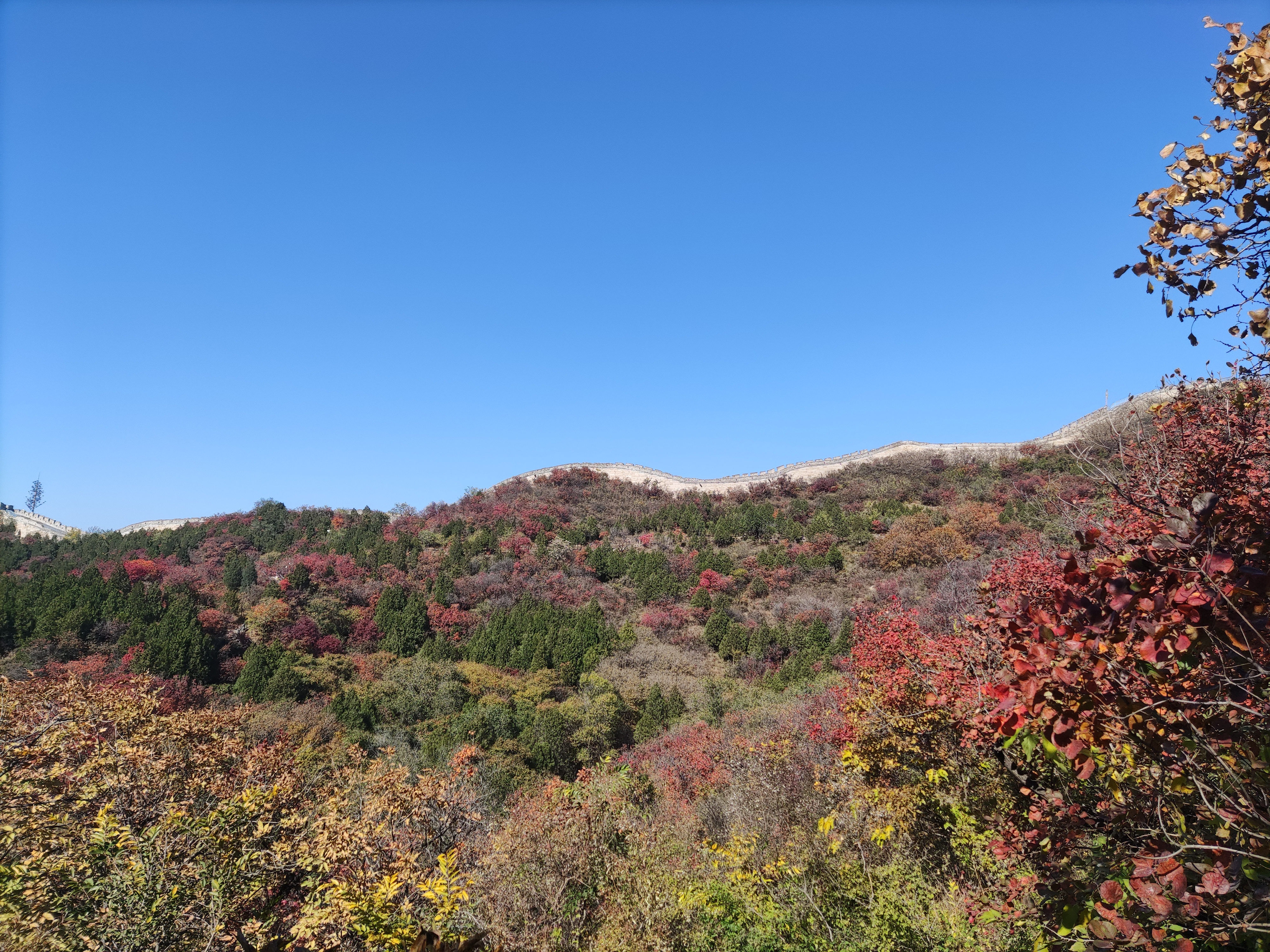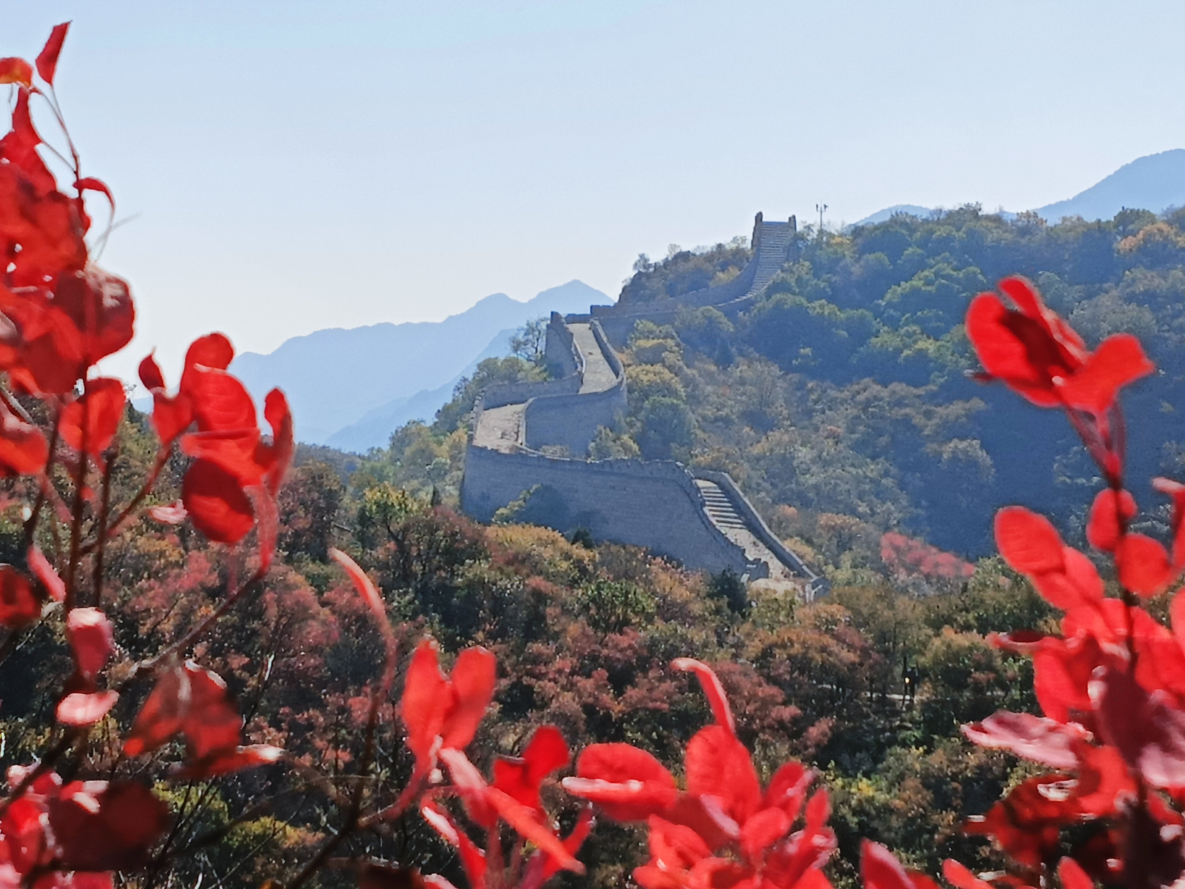 长城蜿蜒于山脊,阳光下的红叶如温暖的火把,点燃了长城的生机。