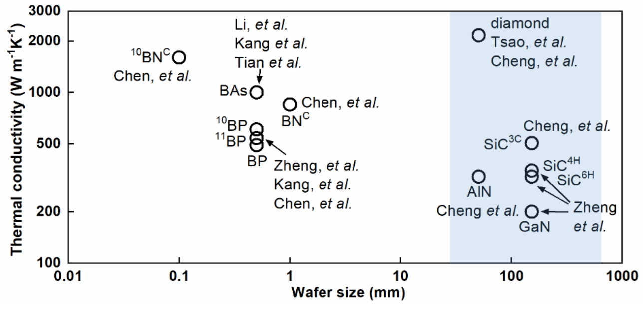 图2. 各种半导体材料的导热系数和晶圆尺寸。