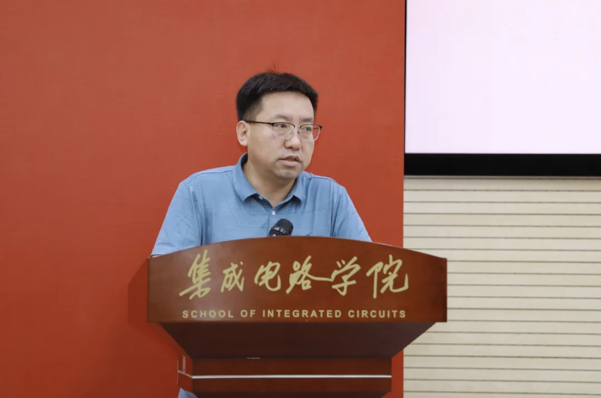 随后,校友代表、长江存储科技有限责任公司首席技术官,集团执行副总裁,研发中心负责人翟宗亮先生致辞。他鼓励毕业生怀抱大志,投身集成电路产业,自信面对挑战,持之以恒学习,成为兼容并蓄的行业精英,为国家科技进步添砖加瓦。