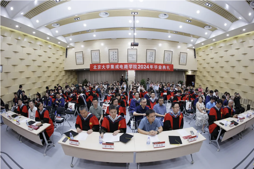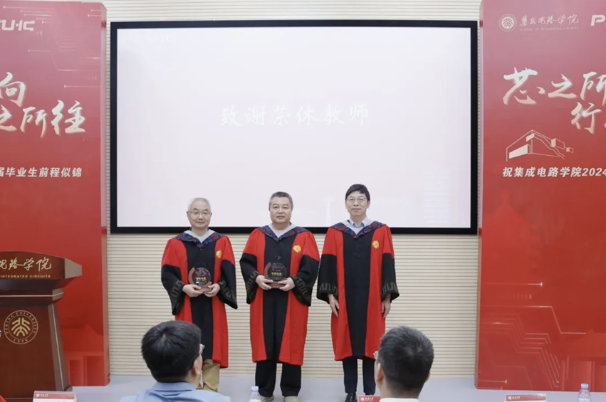 教师代表王玮在致辞中提到三个“恳请”,希望毕业生踏实工作、锐意进取,牢记北大集成电路人的身份和传统,坚持北大风骨。他祝愿毕业生珍重师长、珍重友谊、珍重自己,鹏程万里。