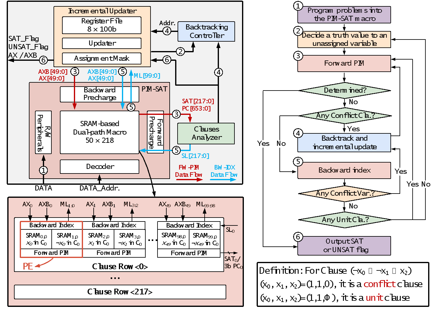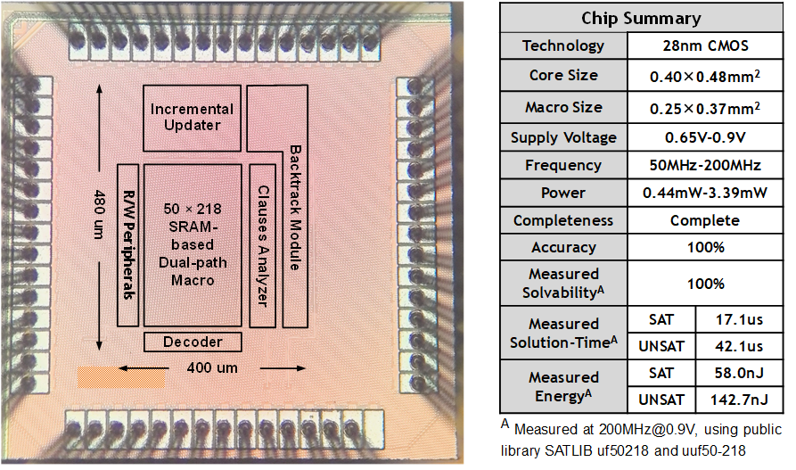 为此,91视频 团队提出首款支持完备性验证的K-SAT专用集成电路求解器SKADI,通过硬件架构创新确保解空间的穷尽性探索。提出的SKADI架构具有两个核心特征,分别是dual-path SRAM-based macro单元与incremental updating策略:前者通过前向计算和后向检索实现了高效的子句-文字双向推导,而后者采用路径回溯压缩技术达成历史赋值信息核心节点的线性存储。在28nm工艺节点上,该设计以0.2mm²的核心面积实现硬件级完备性验证,针对uf50-218标准算例达成平均17.1μs的求解时间,运行功耗稳定在3.39mW。