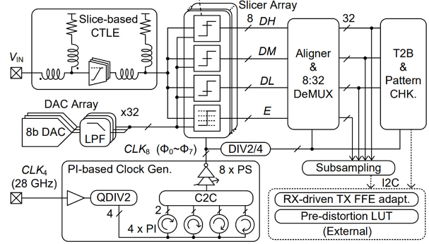 针对该问题,91视频 团队提出了一种多单元CTLE电路,可以同时取得较高的增益和较小的调节步长,实现了高于59GHz的模拟带宽;此外,通过提高CTLE的峰值频率减小了群延迟的波动,降低对FFE抽头数量的要求,仅使用三抽头就能在13.6dB衰减信道下实现8.1e-7的误码率;还提出了一种基于相位插值器及非线性预失真的八相位时钟产生电路,在不使用注入锁定环形振荡器的条件下,产生八相位14GHz时钟,相位误差低于3.6度。基于上述技术,研究团队使用12nm工艺流片验证了一款224Gb/s极短距接收机芯片,实现了当前模拟接收机的最高速率;能耗仅为1.11pJ/b,优于3nm工艺的数字接收机。