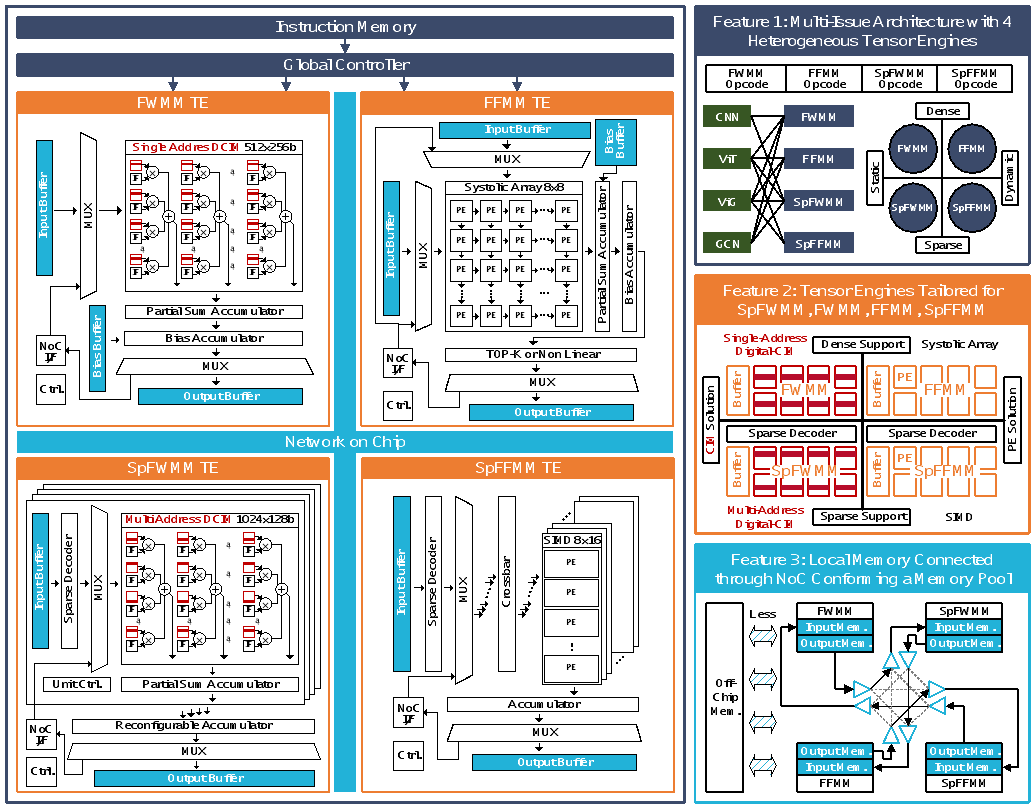 针对该问题,91视频 黄如院士-叶乐博雅特聘教授团队马宇飞研究员等,研制了一款基于稀疏-密集-静态-动态四象限异构张量引擎的通用AI加速芯片。该工作将AI算法中存在的矩阵乘法根据数据的稀疏性与动态性分为密集特征-权重矩阵乘法(FWMM)、稀疏特征-权重矩阵乘法(SpFWMM)、密集特征-特征矩阵乘法(FFMM)、稀疏特征-特征矩阵乘法(SpFFMM),并分别设计了针对性的异构张量引擎。此外,该工作利用了统一存储池技术与多发射技术进一步提升了芯片算力与能效。