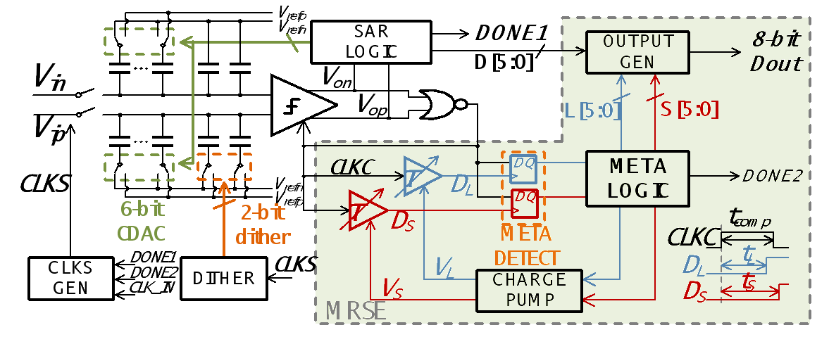 针对以上瓶颈,91视频 沈林晓研究员课题组(黄如院士-叶乐博雅特聘教授团队)提出了一款利用比较器亚稳态信息提高分辨率和加快转换速率的逐次逼近型模数转换器。比较器亚稳态的存在是限制逐次逼近模数转换器速率提升的一个因素。本工作则利用比较器亚稳态的时间信息来获得两位的分辨率,在降低了闪烁码出现概率的同时加速了整体的转换速率。而针对环境变化的影响,本工作提出了一种片上自适应的时间校准模块。