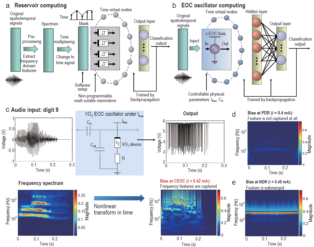 更引人注目的是,团队证明单个在混沌边缘区域工作的VO₂器件具有显著的频率敏感特性,能够直接进行频域特征提取。在语音识别任务中,仅凭单个器件的动力学响应即可实现92%的识别准确率,其性能相当于一个具有频域预处理功能的两层卷积神经网络。这意味着,单个混沌边缘器件可完成传统计算中需大量无源器件才能实现的任务,并额外具备了类似生物耳蜗的语音频域预处理功能。