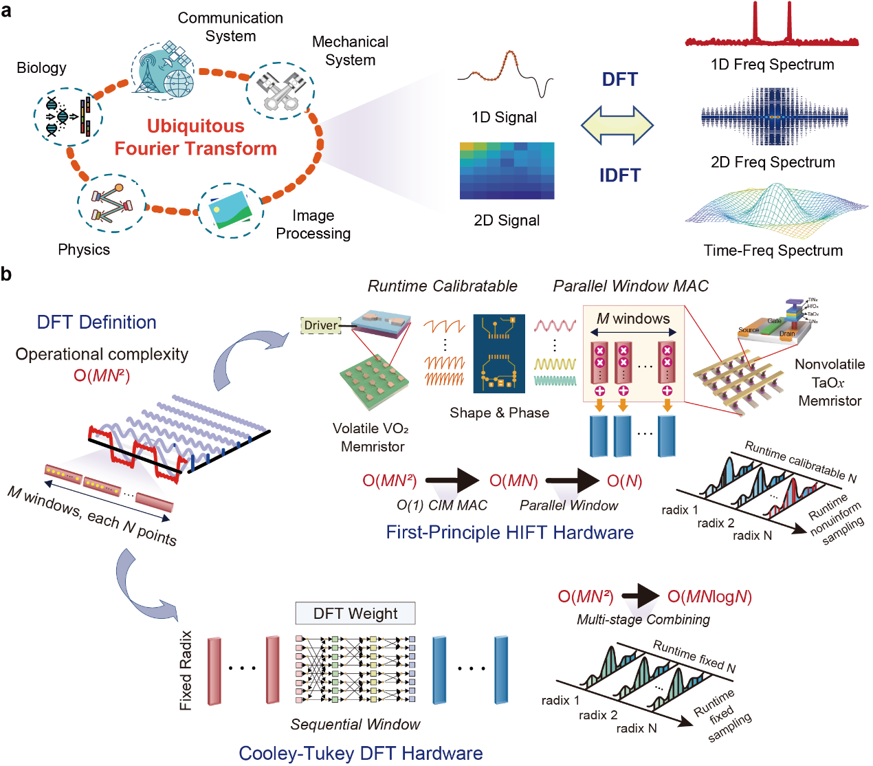 /集成电路高精尖创新中心杨玉超教授、人工智能研究院陶耀宇研究员团队科研团队在国际上首次实现了基于忆阻器异质集成架构的第一性原理傅里叶变换系统(Hetero-Integrated Fourier Transform, HIFT),提出了一种全新的、融合易失型与非易失型忆阻器的高通量频谱计算体系结构。该研究从物理层面重新定义了傅里叶变换的计算机制,实现了在同一硬件平台上对任意基数、均匀或非均匀离散傅里叶变换的统一支持,标志着傅里叶变换硬件体系从算法驱动走向材料与物理原理驱动的重大跨越。相关成果以题为《A first-principle hetero-integrated Fourier transform system based on memristors》的论文,发表于国际顶级期刊《自然·电子》(Nature Electronics)。