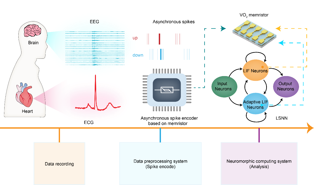 /集成电路高精尖创新中心黄如院士-杨玉超教授课题组首次提出了一种基于VO2忆阻器的高效神经形态生理信号检测系统。该团队首先针对系统中关键的信号编码和信号处理两部分进行了优化设计。在编码环节中,该团队巧妙地利用VO2忆阻器的易失性阈值阻变特性以及该特性在正负偏压下的高度对称性,设计了一种能够对模拟信号的增量进行脉冲编码的异步脉冲编码器,编码后的脉冲序列具有高稀疏度且最大程度保留了原始信号的信息。在处理环节中,该团队充分地利用了VO2忆阻器的动力学行为,在基于此的泄漏-积累-发放神经元(LIF)的基础上设计了一种具有更强大的时域信息处理能力的自适应LIF神经元(ALIF),并将这两种神经元引入到一种具有长短时程记忆的脉冲神经网络(LSNN)中处理时序信号。