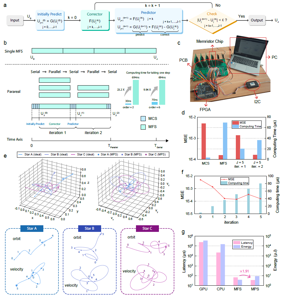 该系统基于实际流片的忆阻器芯片,结合PCB与FPGA搭建了端到端的应用演示平台,全面验证了其在典型ODE求解任务中的优越性能。该系统采用了三种不同的求解模式,以应对不同精度和速度需求的ODE问题。粗求解器利用忆阻器阵列的模拟计算能力,成功求解了指数函数问题,适用于对速度要求较高但精度要求较低的场景。细求解器则通过数字计算,精确求解了洛伦兹方程,能够在保证高精度的同时,较为平衡地控制计算开销。并行求解器则采用了粗细混合的前瞻性求解策略,成功求解了经典的三体问题,通过并行计算大幅提升了求解速度和精度,适用于复杂的高并发任务。实验结果表明,这三种求解模式在不同任务中均表现出了优异的性能,相较于现有的CPU/GPU系统,该系统在三类经典ODE问题上实现了高达601~6.92×103倍的速度提升、1.71×103 ~3.93×103倍的能效提升,充分展示了忆阻器存算一体架构在常微分方程求解中的强大潜力,进一步证明了这一创新架构的前景。