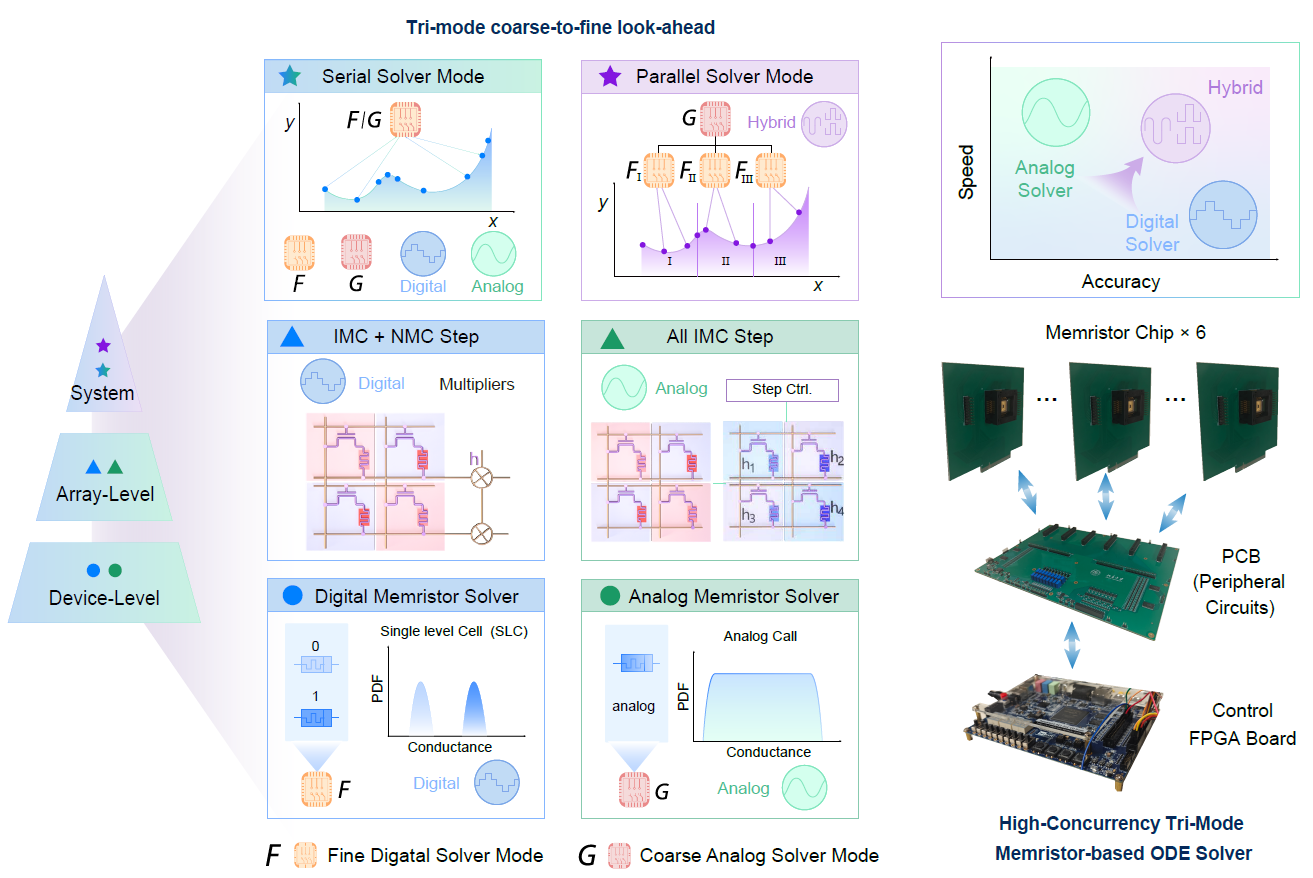 杨玉超教授团队首次提出了一种高并发的基于忆阻器的三模式ODE求解器,该求解器通过高效的软硬件协同设计和创新的编程和计算方法,无需重复编程即可求解任意ODE系统,大幅提升了求解速度和能效。该工作创新性地提出了基于忆阻器的三模式求解框架,结合了粗略求解、精细求解以及粗细混合的前瞻性求解模式,极大提升了并行处理能力和计算效率。为了进一步提升求解精度和计算效率,研究团队还提出了基于历史的忆阻器编程方案(History-based Memristor Programming, HMP),通过优化写入过程,显著提高了设备编程速度,同时保持了出色的精度。此外,团队还设计了存内步长计算方法,利用忆阻器阵列实现了步长自适应控制,存内一次性完成步长计算,避免了传统方法中频繁的外部计算和存取,极大降低了能耗和计算延迟。这一创新方案推动了存算一体ODE求解硬件系统的性能突破,使得在复杂ODE任务中能够实现高效的并行计算。