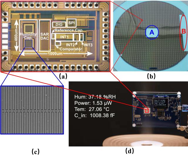(a)硅基片上一体化集成的高能效电容型感知芯片的顶视显微照片