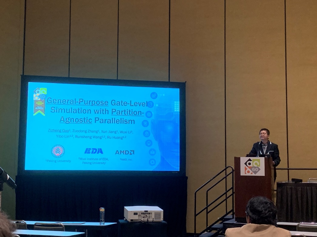 带延迟标注的门级逻辑仿真在芯片设计流程中具有重要地位,然而它极为耗时。针对百万门级设计的逻辑仿真通常需要数小时乃至数天才能完成,这拖慢了整个芯片设计迭代的周期。这类逻辑仿真运行缓慢的根本原因是它难以进行快速、准确的并行计算,而这是由于信号传播因果关系的建模具有内在的复杂性。针对这一难题,林亦波研究员-王润声教授团队提出了基于稳定时间机制的带延迟逻辑后仿加速技术。这一技术精确计算了末次信号翻转事件的持续时间(即稳定时间),利用状态压缩动态规划方法,针对任意种类的时序逻辑门预处理输出和输入之间的敏感性依赖关系,建立逻辑单元库的扩展状态表。在扩展状态表的基础上,门级逻辑仿真按电路拓扑顺序并行传播信号翻转事件,同时推理出下一逻辑层级的最长稳定时间。利用这一算法,此工作在学术界首次实现了通用、无需图分割的并行门级逻辑仿真算法,并实现了CPU/GPU异构并行计算平台上的高效仿真,相比商业工具实现了平均7.8倍的加速。该工作以《General-Purpose Gate-Level Simulation with Partition-Agnostic Parallelism》为题发表(博士生郭资政为第一作者,林亦波研究员为通讯作者)。