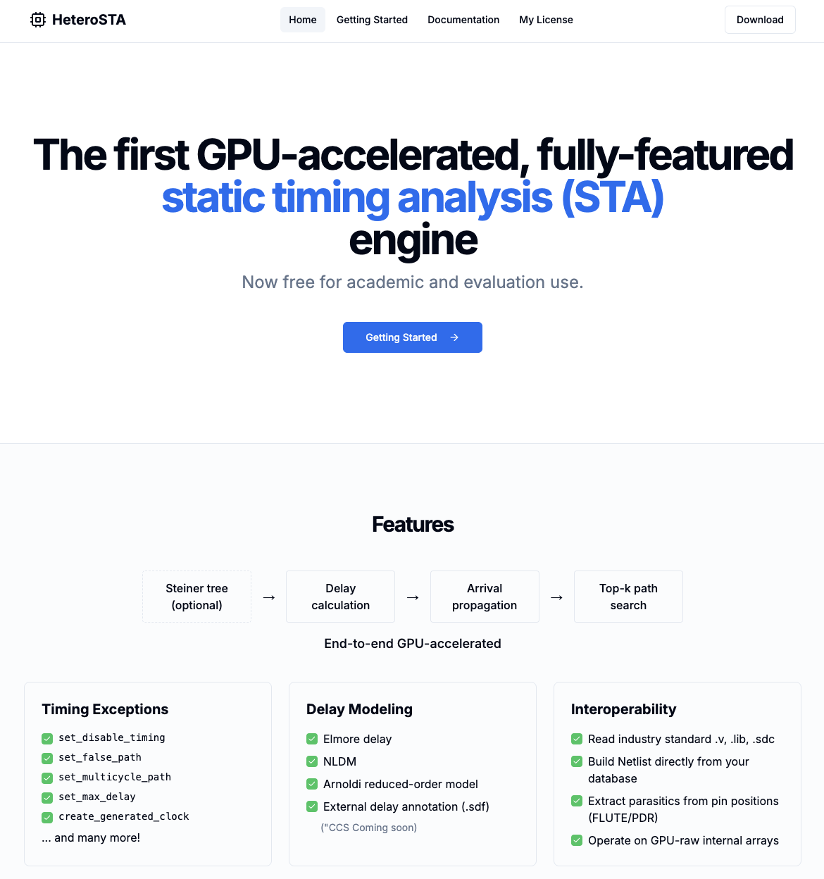 HeteroSTA是业界首款面向工业级设计场景的CPU–GPU异构加速静态时序分析引擎。与传统工具相比,HeteroSTA具备以下核心优势: