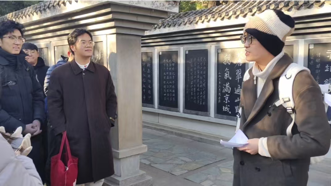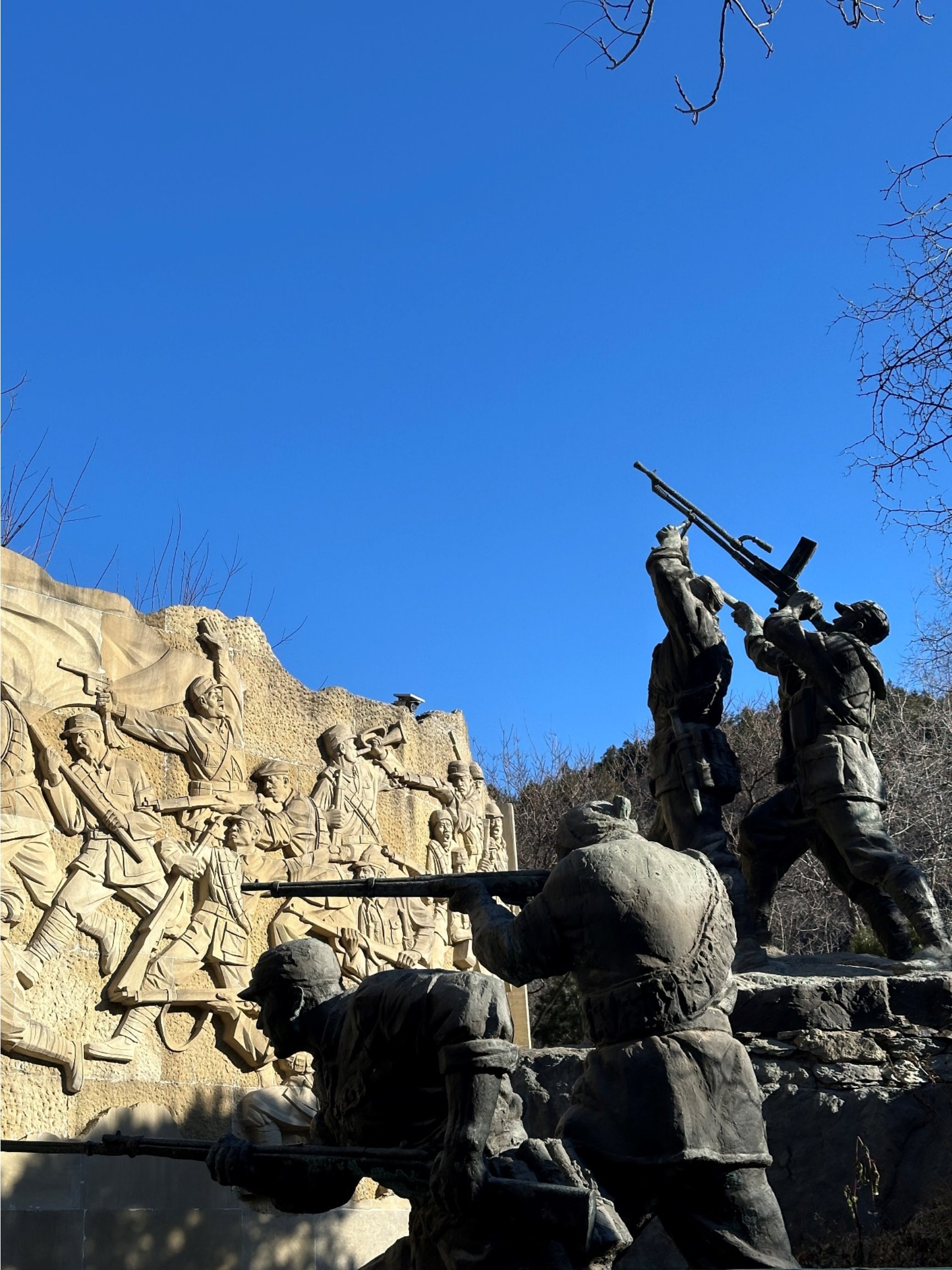 在黑山扈战斗纪念园,同学们在第三小组的介绍下重温了这段历史。“黑山扈抗日战争纪念园”由碑文、纪念浮雕墙及雕塑三部分组成。1937年9月8日,由中国共产党地下工作者领导的国民抗日军与日军在百望山英勇搏斗,这是国民抗日军第一次和日军正面交锋,打死打伤多名日军,创造了首次用轻武器打下敌人飞机的历史,不仅打击了敌人猖狂的侵略气焰,更是增强了我方抗战军民的信心。革命先辈的爱国主义和英雄主义精神让人敬仰,让同学们深刻意识到今日之和平稳定来之不易,作为后来者自身肩负着传承历史、创造未来的使命。同学们在碑文下再次举起右拳,重温入党誓词,决心响荡于山风之中。
