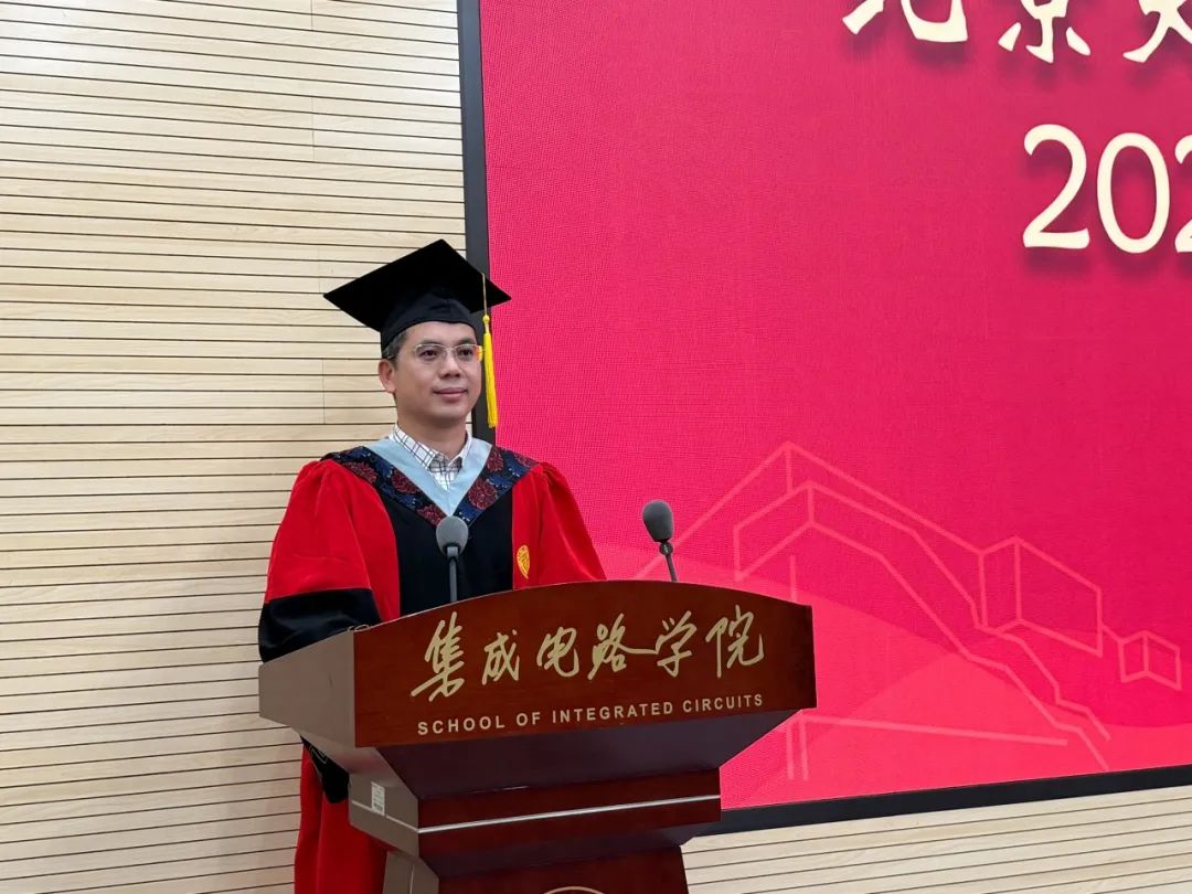 院长蔡一茂在致辞中对2025届毕业生圆满完成学业表示祝贺,并感谢师长、家长的支持。他回顾了近年来同学们在国家大力发展集成电路背景下的求学历程,并强调集成电路事业肩负国家战略使命,希望大家秉持北大优秀集成电路人不畏艰难、勇于创新的传统,推动我国集成电路事业发展。在致辞中,他鼓励毕业生志存高远、涵养品格,把个人理想融入民族复兴伟业,并祝愿同学们在今后的日子里内心永远保持着载流子般的活力,像3D IC一样层层堆叠出精彩梦想,像EUV光刻般精准聚焦未来,像最灵敏的传感器般敏锐地体验丰富多彩的人生。