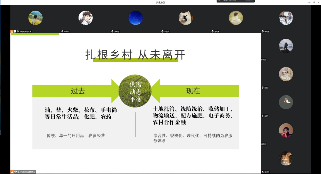 接着由焉祯同学带来《学习贯彻全国两会精神——又走“老路”?乡村振兴的合作新路》为主题的报告,焉祯同学结合今年“两会”背景,就报告中的“供销合作社”相关表述进行了宣讲。焉祯同学从供销合作社的历史发展讲起,同时紧密结合党的十八大以来的供销合作社相关重要论述,对供销合作社的作用以及与乡村振兴的关系进行了详细解读。最后,焉祯同学指出,今天的供销合作社合作新路需牢牢坚持“为农服务”根本宗旨,绘就出通往乡村振兴的道路。