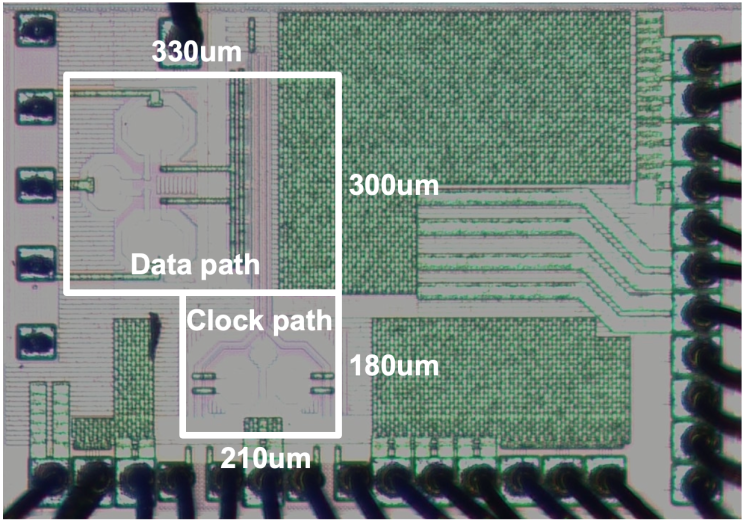 基于上述创新技术,课题组研制了一款基于延迟线的200Gb/s接收机前馈均衡器芯片。该芯片实现了对200Gb/s数据的均衡,可提供高达17.2dB的均衡能力,且能效比仅0.43pJ/b,均为接收机连续时间前馈均衡器的最优水平。该均衡器芯片具有高带宽、低功耗、低噪声的优势,可广泛用于数据中心、Chiplet等串行数据传输应用中,为未来短距200Gb/s接收机提供了全新的低功耗解决方案。