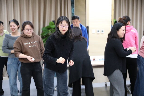 接着进入互动游戏环节。游戏由工会文体委员王媛、姜博岩联手主持,将全体老师分为两队进行比赛。每队15 人,每人至少参加1 个游戏;每队选出1 名队长,由队长分配游戏任务。比赛采用三局两胜制,共设置了乒乓投手、跳跃选果接力和珠行千里三个趣味横生的游戏项目。乒乓投手考验大家的手眼协调能力,老师们精准投掷,展现了不凡的协调与技巧;跳跃选果接力中,大家身手矫健,配合默契,将速度与智慧完美结合;而珠行千里游戏,则更是考验了大家的耐心与团队协作能力,每一颗珠子的顺利传递都凝聚着团队的智慧与汗水。