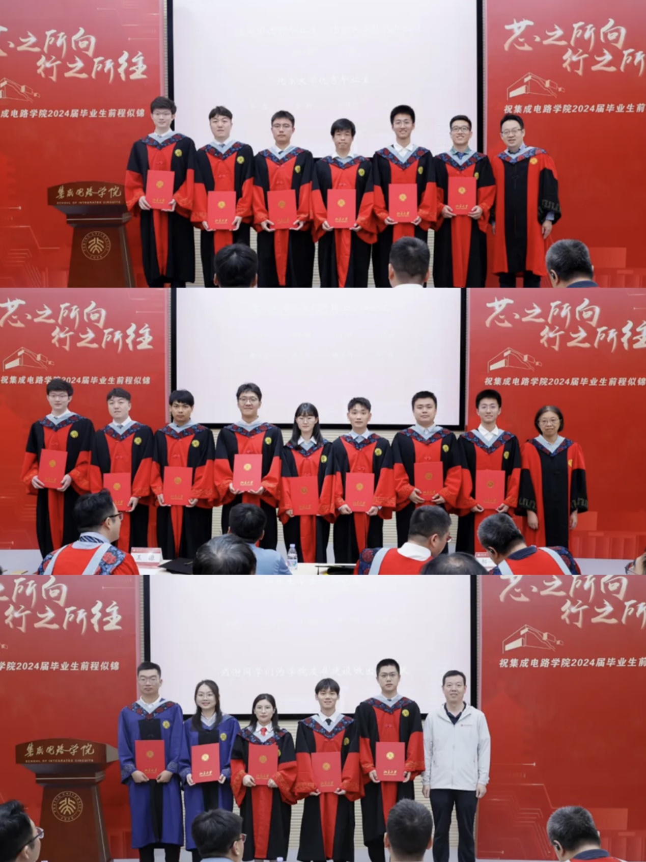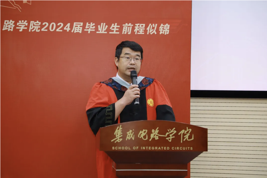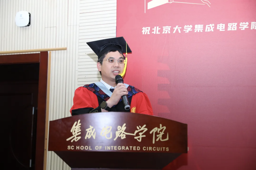 教师代表王玮在致辞中提到三个“恳请”,希望毕业生踏实工作、锐意进取,牢记北大集成电路人的身份和传统,坚持北大风骨。他祝愿毕业生珍重师长、珍重友谊、珍重自己,鹏程万里。