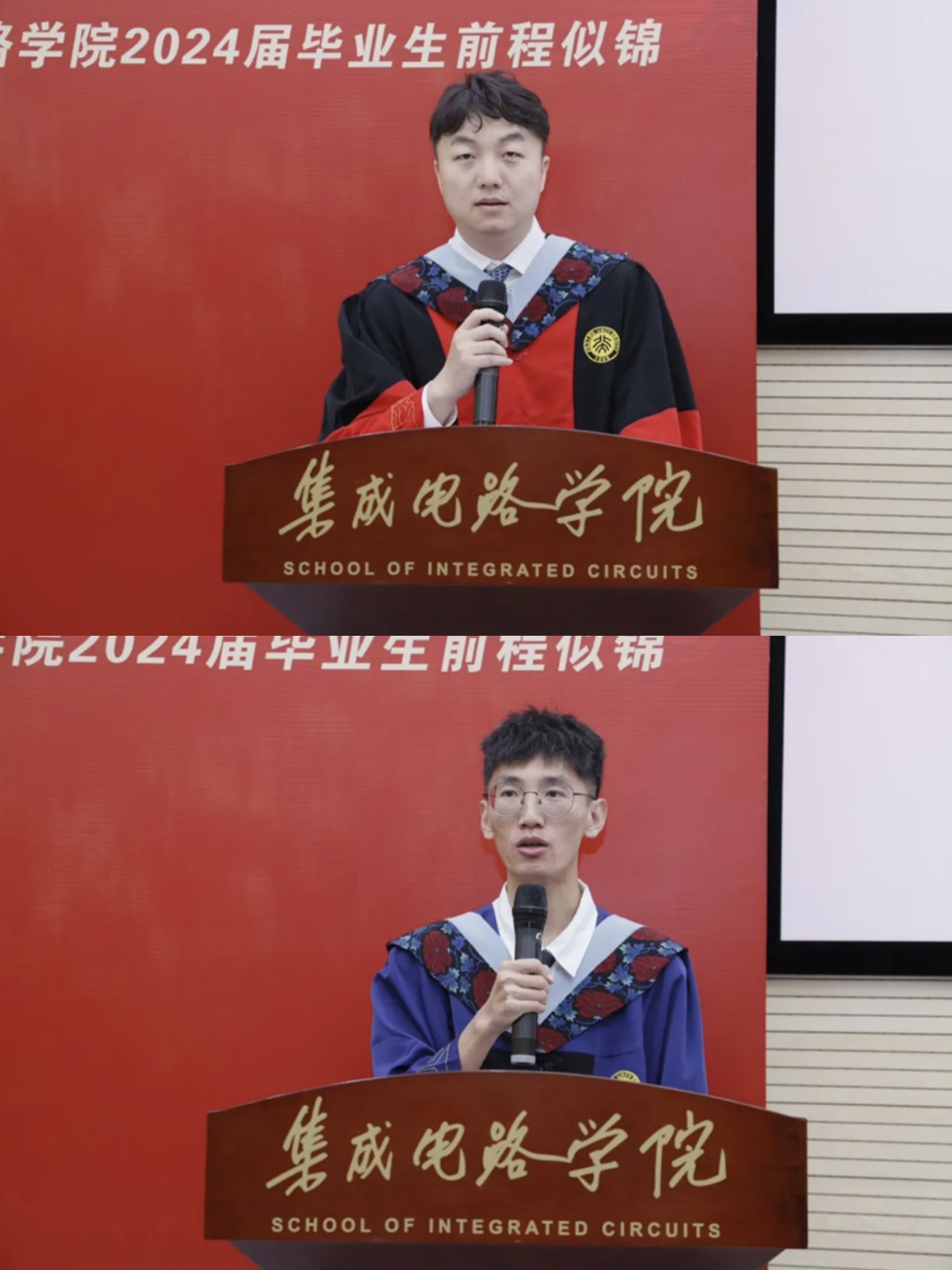 接着,博士毕业生代表孙梓轩在发言中,感谢了师长和亲友的支持,呼吁毕业生们,为实现科技强国贡献青春力量。硕士毕业生代表李文俊回顾了自己的三年北大生涯,面对半导体产业的风云变幻,他祝愿同学们锚定方向,勇往直前。