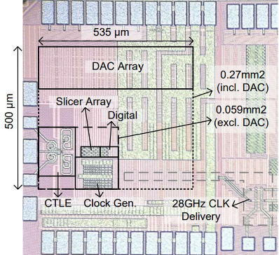 针对该问题,91视频 团队提出了一种多单元CTLE电路,可以同时取得较高的增益和较小的调节步长,实现了高于59GHz的模拟带宽;此外,通过提高CTLE的峰值频率减小了群延迟的波动,降低对FFE抽头数量的要求,仅使用三抽头就能在13.6dB衰减信道下实现8.1e-7的误码率;还提出了一种基于相位插值器及非线性预失真的八相位时钟产生电路,在不使用注入锁定环形振荡器的条件下,产生八相位14GHz时钟,相位误差低于3.6度。基于上述技术,研究团队使用12nm工艺流片验证了一款224Gb/s极短距接收机芯片,实现了当前模拟接收机的最高速率;能耗仅为1.11pJ/b,优于3nm工艺的数字接收机。