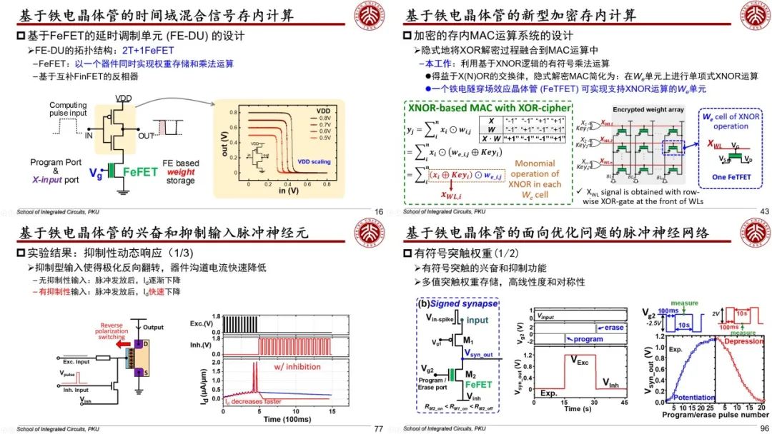 本文围绕神经形态计算中存内计算和脉冲神经网络两条关键技术路线,基于铁电晶体管(FeFET)的特性进行了器件-电路-算法的协同设计,在降低硬件开销、提升能效的同时实现了功能拓展。面向非易失性存内计算系统,首次结合时间域计算的优势,提出一种基于FeFET的新型混合信号存内计算系统。进一步,针对边缘端非易失性系统的硬件安全问题,对加密算法和硬件进行协同设计,提出一种基于新型铁电隧穿场效应晶体管的加密存内计算系统,在增强安全性的同时能提升面积效率和能效。另一方面,面向仿生脉冲神经网络,首次提出利用双向铁电极化翻转模拟兴奋和抑制的动态,实现了一种基于新型FeFET的脉冲神经元。进一步基于FeFET实现了新型自适应随机脉冲神经元和有符号突触,显著降低脉冲神经网络系统的硬件开销。以上工作为神经形态计算系统的大规模硬件集成和高级功能的实现奠定了基础。