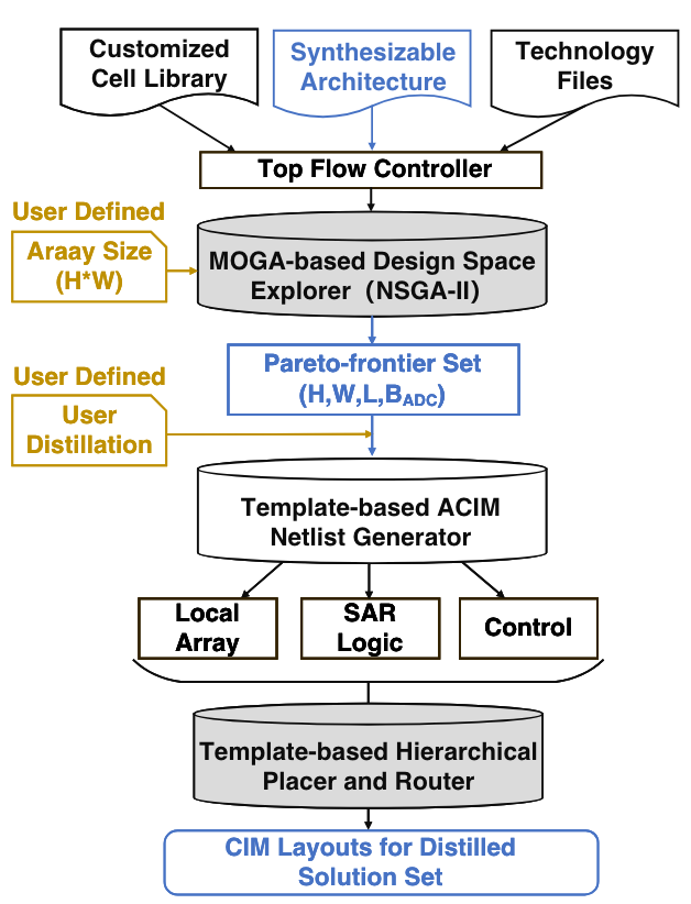模拟存内计算(ACIM)是一种新兴架构,可用于执行高效的人工智能边缘计算。然而,目前的 ACIM 设计通常具有不可扩展的拓扑结构,并且仍然严重依赖人工操作。这些弊端限制了 ACIM 的应用场景,并延迟了设计者的设计时间。针对该问题,林亦波研究员-王润声教授团队提出了一种基于可合成架构的端到端自动化 ACIM(EasyACIM)。在给定阵列尺寸和定制单元库的情况下,EasyACIM 可以端到端自动生成具有各种设计规范的 ACIM 布局。利用基于多目标遗传算法(MOGA)的设计空间探索器,EasyACIM 可以基于所提出的可合成架构获得高质量的 ACIM 解决方案,从而满足各种应用场景的需求。与最先进的(SOTA)ACIM 相比,EasyACIM 提供的 ACIM 解决方案具有广阔的设计空间和极具竞争力的性能。该工作以《EasyACIM: An End-to-End Automated Analog CIM with Synthesizable Architecture and Agile Design Space Exploration》为题发表(博士生张昊懿为第一作者,林亦波研究员为通讯作者)。