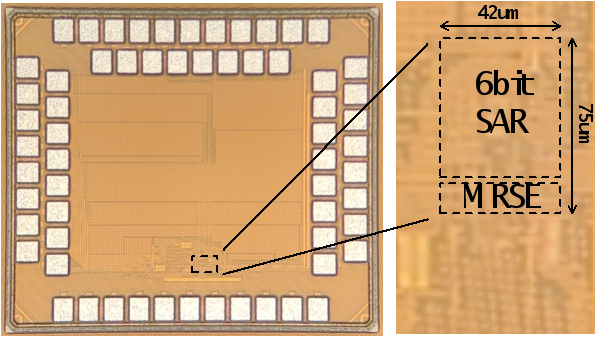 基于上述电路层面的创新,课题组研制了一款基于22nm CMOS工艺的高速高能效的模数转换器芯片。该芯片在1GS/s的采样率下实现了47.2dB SNDR的精度和4.15mW的功耗,在相近分辨率的单通道模数转换器中达到了较高的精度和保持了较高的能效(22.23fJ/conv.-step FoMw)。