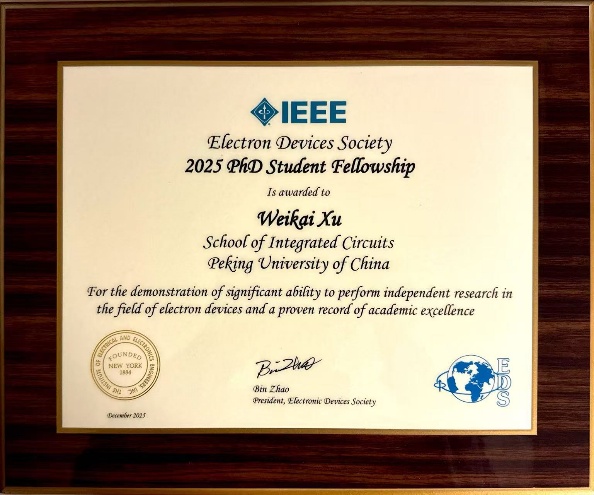 图2. 徐伟凯获评IEEE电子器件协会全球博士奖学金证书
